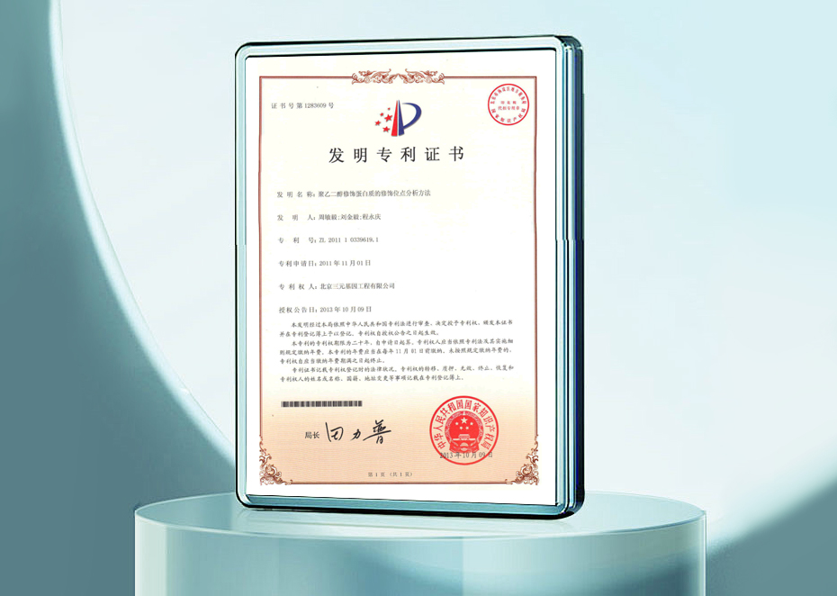 發(fā)明專利證書-聚乙二醇修飾蛋白質(zhì)的修飾位點(diǎn)分析方法