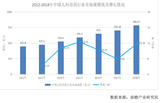 我國兒童用藥市場,不論是在規(guī)模上,還是在增速上,都較為可觀。數(shù)據(jù)顯示,2018年,我國兒科用藥市場規(guī)模達(dá)到786億元,同比增長11.72%,據(jù)預(yù)計(jì)2020年市場規(guī)模在千億元以上。