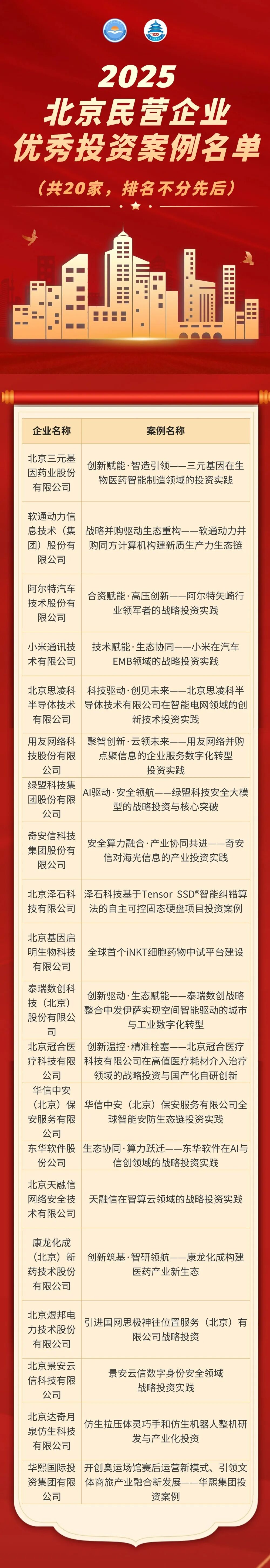 憑借在生物醫(yī)藥領(lǐng)域的投資布局與創(chuàng)新成果,"三元基因在生物醫(yī)藥智能制造領(lǐng)域的投資實(shí)踐"案例成功斬獲"2025 北京民營(yíng)企業(yè)優(yōu)秀投資案例"殊榮。此次優(yōu)秀投資案例評(píng)選與百?gòu)?qiáng)榜單發(fā)布同屬北京市工商業(yè)聯(lián)合會(huì)組織的民營(yíng)經(jīng)濟(jì)發(fā)展成果展示系列活動(dòng),旨在發(fā)掘民營(yíng)企業(yè)投資創(chuàng)新典范,展現(xiàn)首都民營(yíng)經(jīng)濟(jì)高質(zhì)量發(fā)展活力,從商業(yè)價(jià)值、市場(chǎng)前景、商業(yè)模式、技術(shù)創(chuàng)新性、團(tuán)隊(duì)情況、社會(huì)效益、投后管理和案例質(zhì)量8個(gè)維度構(gòu)建評(píng)價(jià)體系,鼓勵(lì)民營(yíng)企業(yè)梳理投資領(lǐng)域的成功實(shí)踐,展示其通過(guò)投資布局推動(dòng)技術(shù)創(chuàng)新、產(chǎn)業(yè)升級(jí)、經(jīng)濟(jì)增長(zhǎng)和社會(huì)發(fā)展的成果。本次評(píng)選經(jīng)資格審核、專家評(píng)審、社會(huì)公示等多輪環(huán)節(jié)后,最終遴選出20個(gè)優(yōu)秀投資案例。三元基因的入選既是對(duì)其投資戰(zhàn)略前瞻性的高度認(rèn)可,也為生物醫(yī)藥行業(yè)投資發(fā)展提供了實(shí)踐標(biāo)桿。