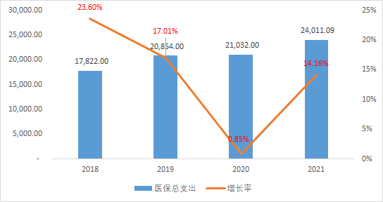 醫(yī)保基金支出近4年年復(fù)合增長率達10.45%,醫(yī)保支出的增速略大于醫(yī)保收入的增速。但值得注意的而是,從2020年開始,醫(yī)保支出的增速開始小于醫(yī)保收入的增速,說明國家醫(yī)保控費取得較好的效果。