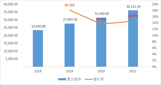 醫(yī)保累計結(jié)存增速較快,近4年年復(fù)合增長率達15.51%。截至2021年末,醫(yī)保累計結(jié)存36121.54億元。